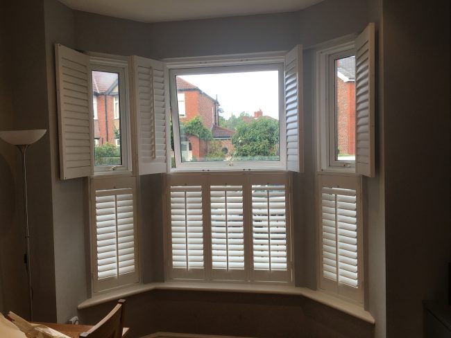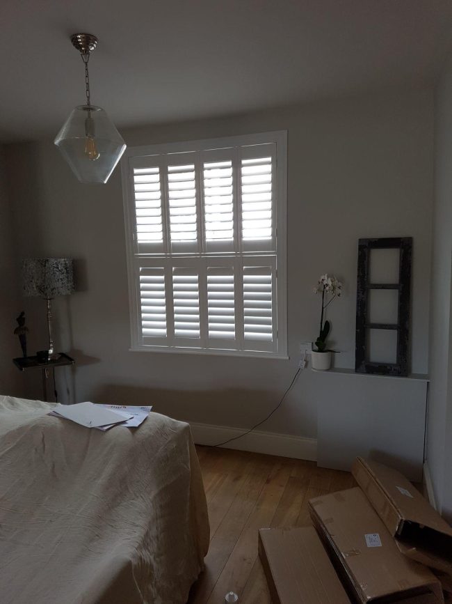 Before & after of the first of two planation shutters installs in Manchester – A large 3 sided bay window fitted with hardwood poplar, tier on tier planation shutters – in bright white for contrast against the grey walls and classic front push rods to match the style of the property ?