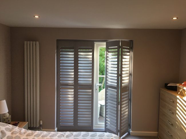 Check out this recent Patio Door Shutter install in Knutsford! Grey hardwood, track door shutters that effortlessly slide open revealing the space behind.