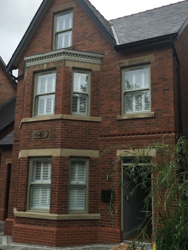This property in Stockport is absolutely stunning ? Tier on tier shutters throughout the whole front of the house, with medium size louvers & front pushrods – finished in bright white.