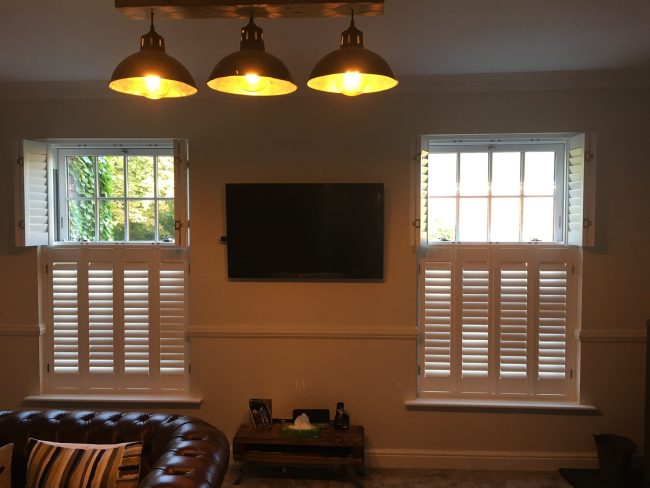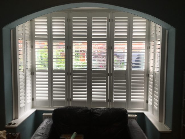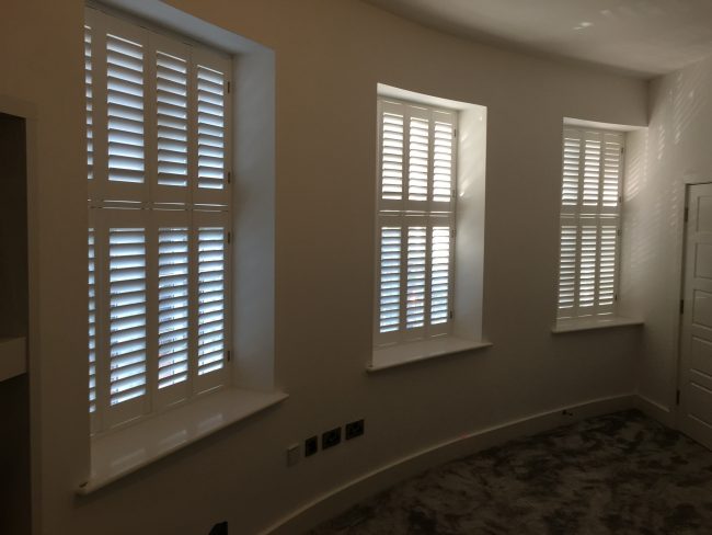 Check out is install in Boothstown, Salford – Not your normal window layout but looks great! 3 sets of tier on tier planation shutters for the windows in this curved wall.