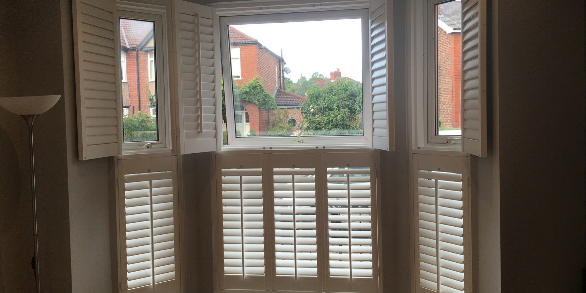 Before & after of the first of two planation shutters installs in Manchester – A large 3 sided bay window fitted with hardwood poplar, tier on tier planation shutters – in bright white for contrast against the grey walls and classic front push rods to match the style of the property ?