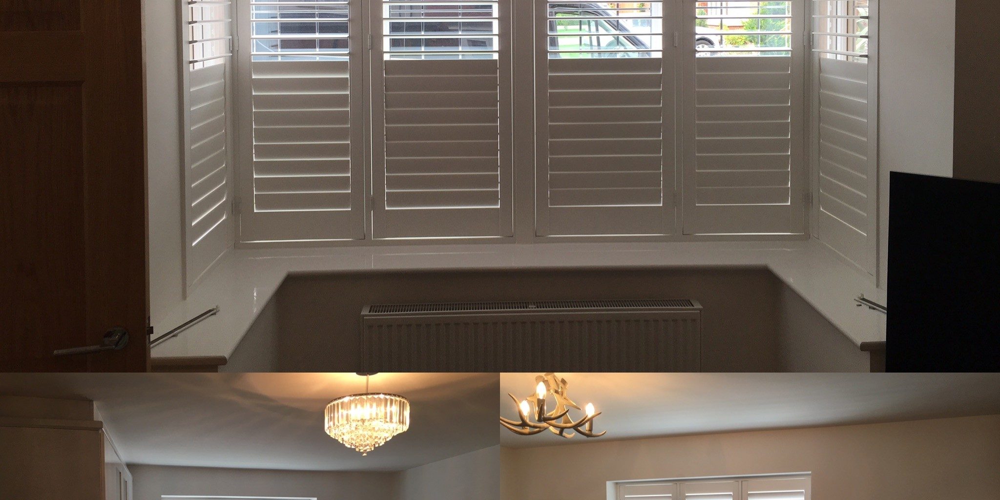 A recent full house installation in Manchester – The bedroom, living room, bathroom and conservatory door fitted with white hardwood shutters.