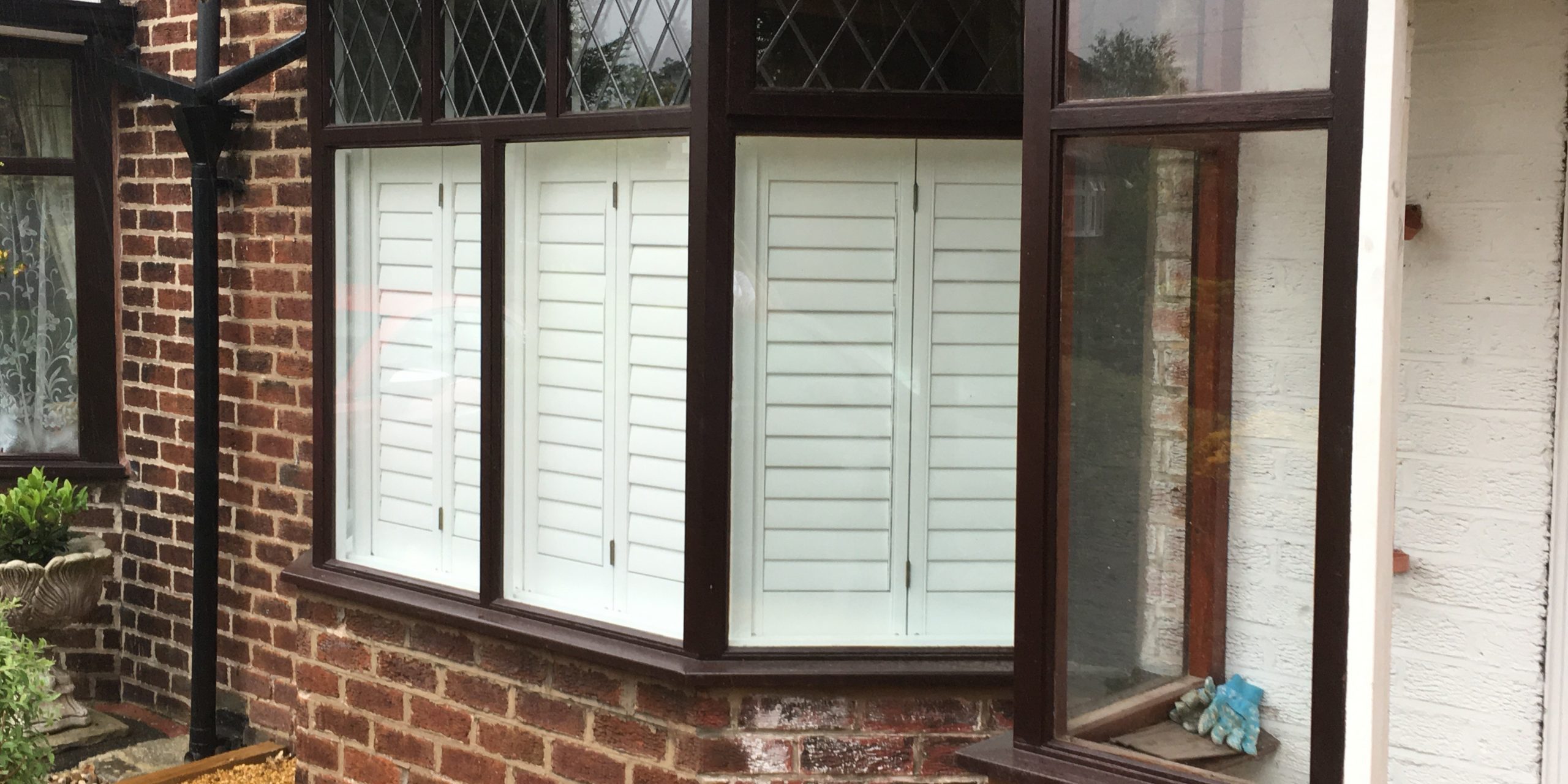 A delighted customer in Cheadle Hulme, not far from our Showroom. Look at the difference in privacy for this street front, 3 sided bay window now it has been fitted with our Café Style Shutters.