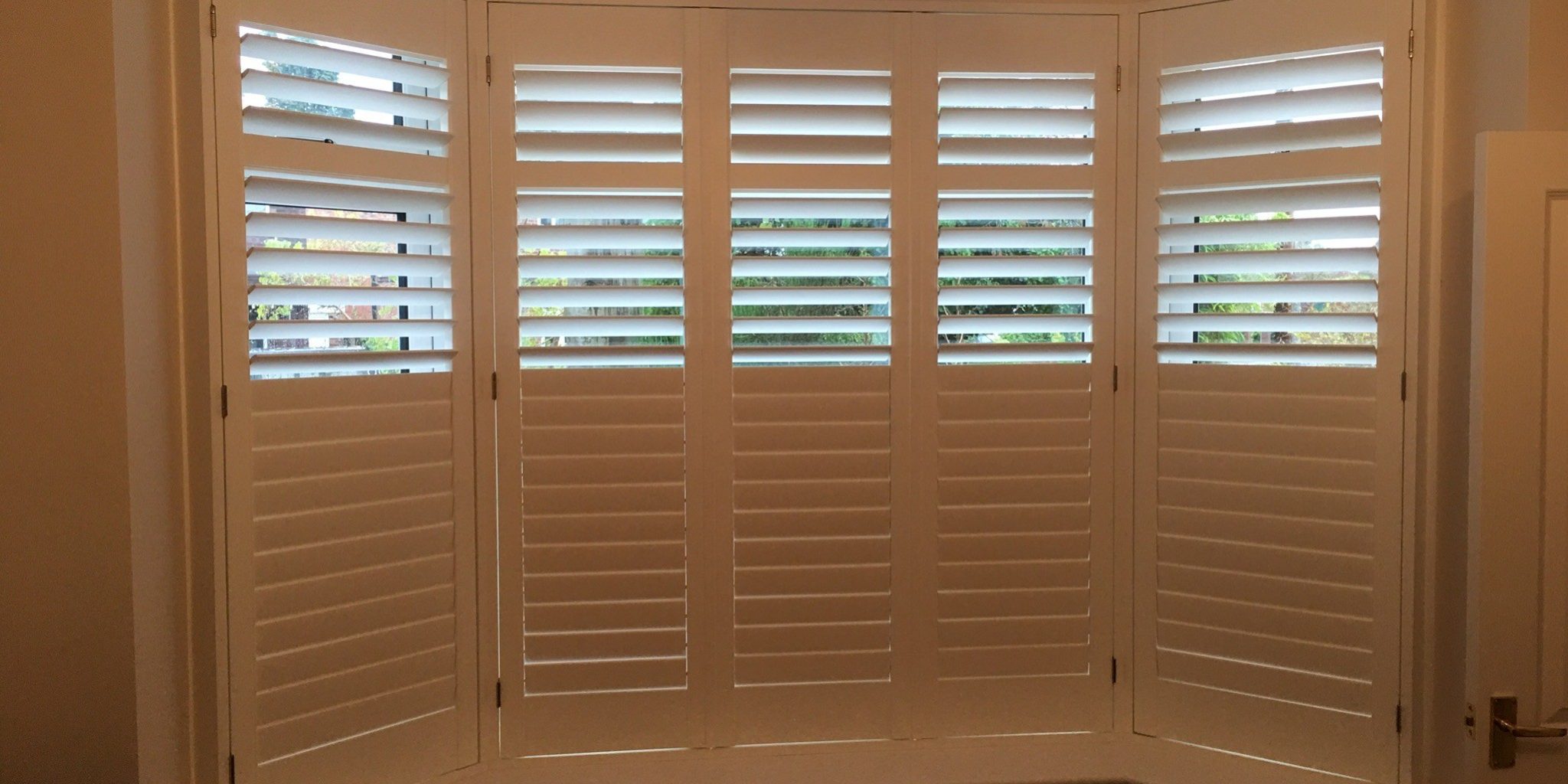 5 windows at the front of this house in Wilmslow fitted with wooden shutters this week – 1 flat window and 4 bay windows – with hidden pushrods & concealed splits in the louvers.
