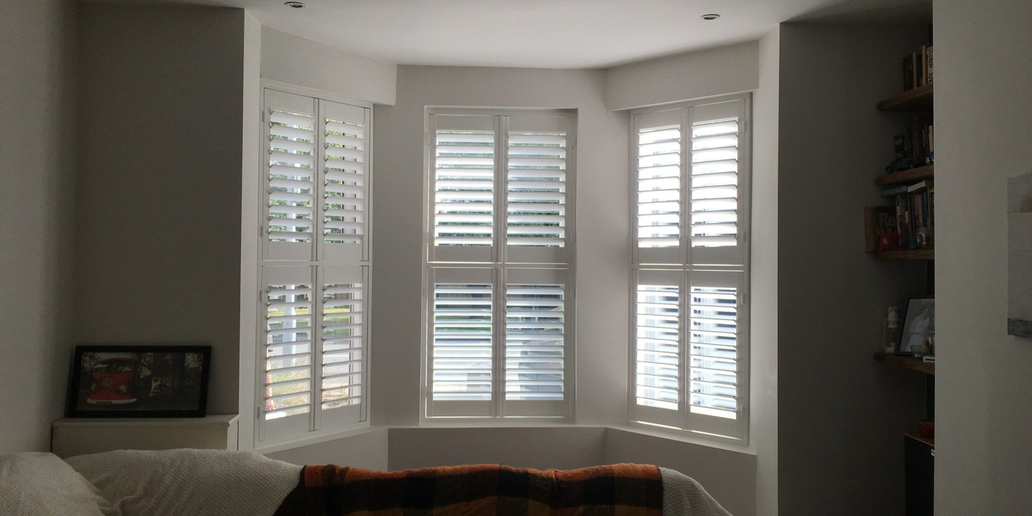 Three windows at the front of this house in Heald Green, Cheadle, fitted with tier on tier shutters. The sun even came out for the install! ☀️