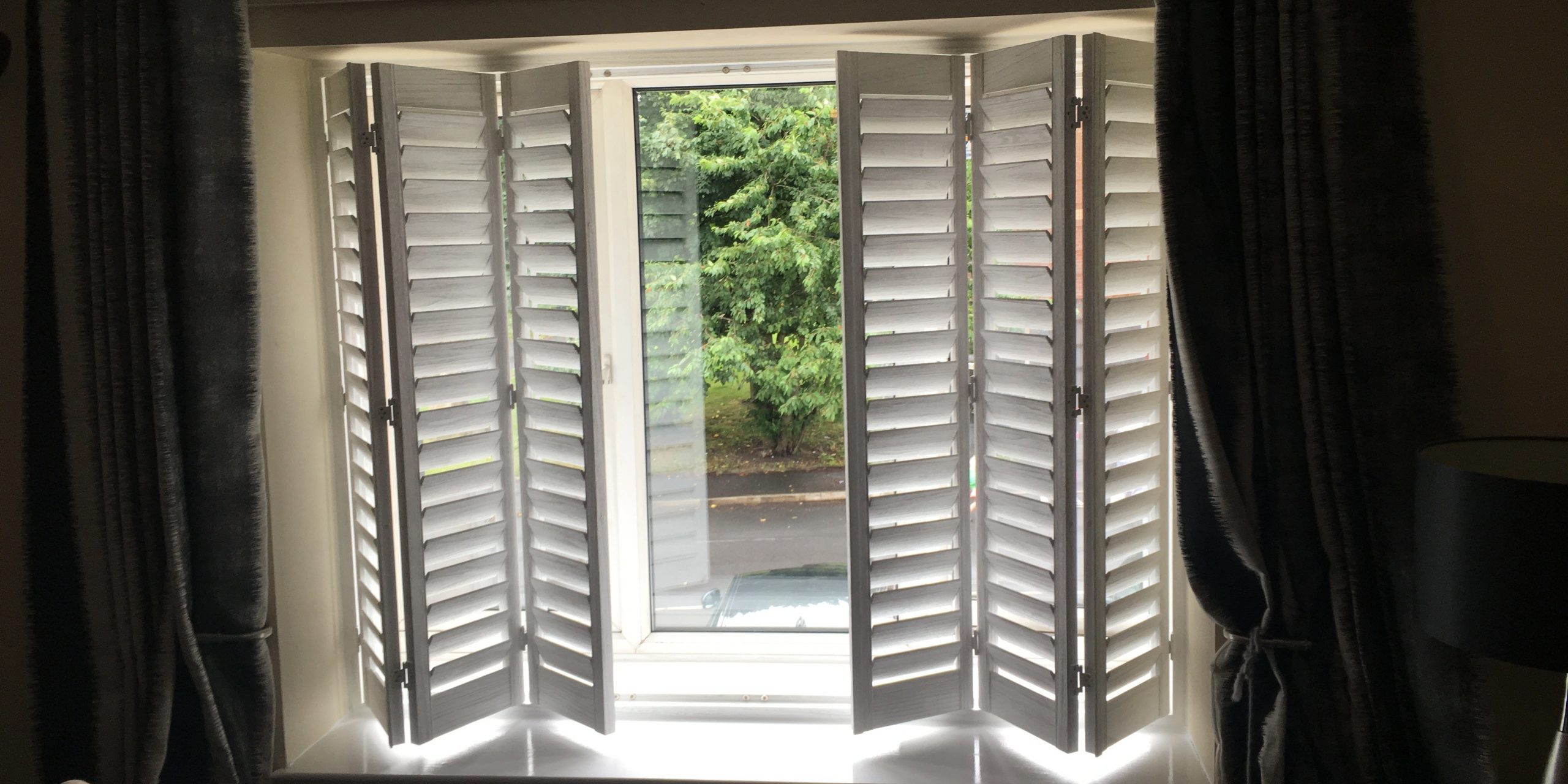 Another happy customer in Failsworth, Manchester: Large bi-folding shutters with a concealed split. Bi-folding shutters can be opened completely with no frame covering the window, giving a perfect view out