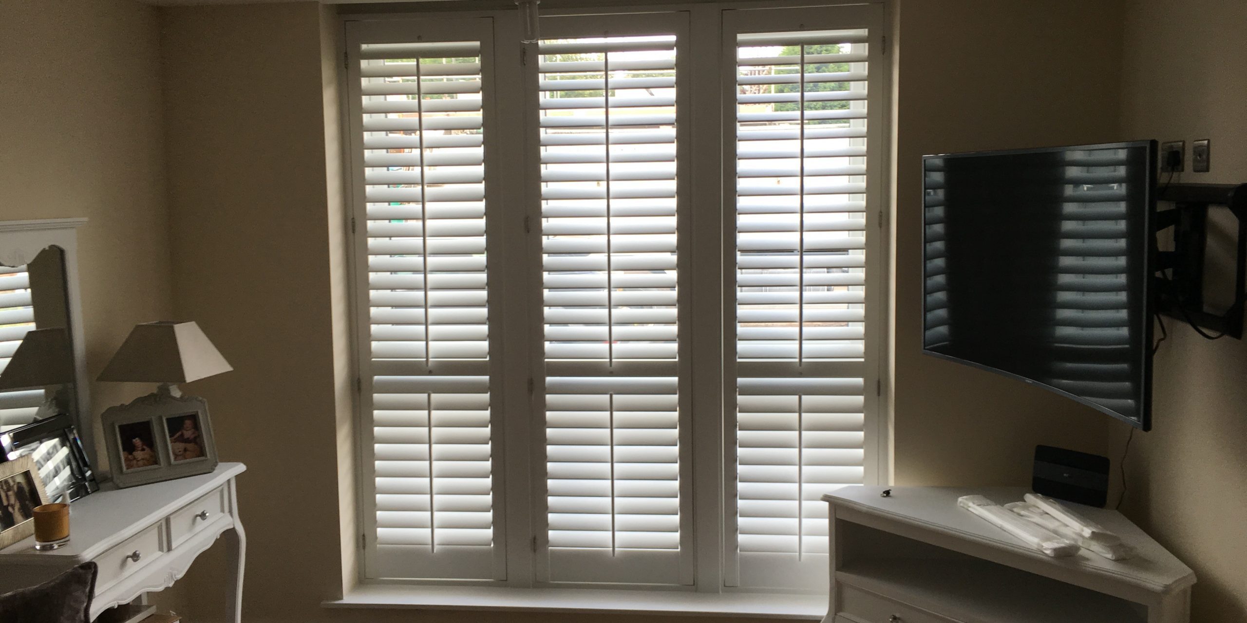 Before & after of this massive window shutter installation in Failsworth, Manchester. This window is bigger than some of the patio doors we have installed planation shutters in!